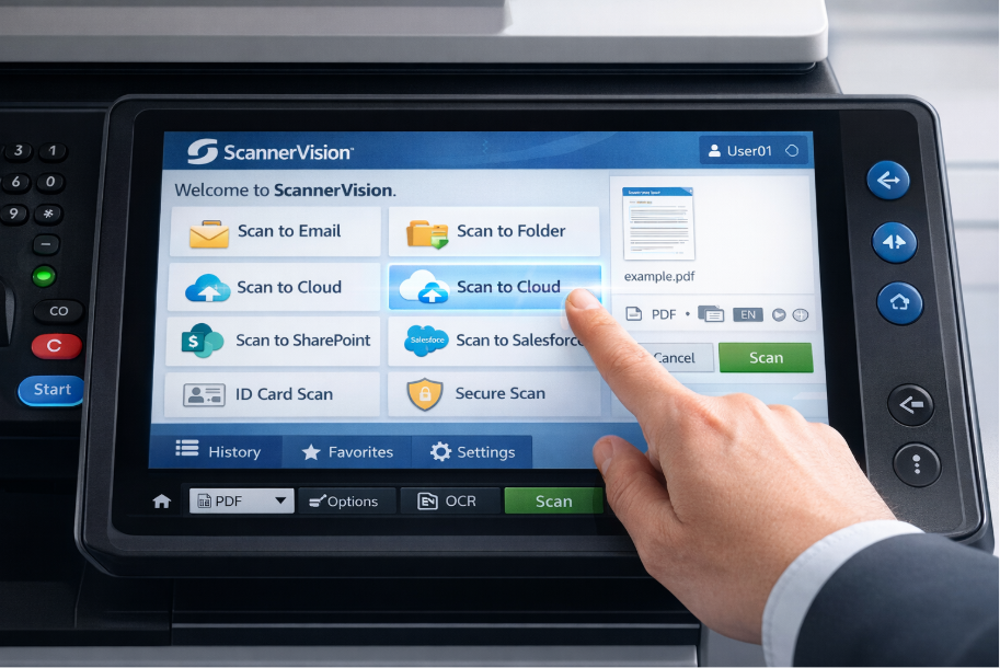 ScannerVision is a powerful document management and workflow automation software that integrates seamlessly with multifunction printers (MFPs) and copiers. It enables businesses to scan, process, distribute, and store documents with greater accuracy and speed — all from a familiar copier interface.